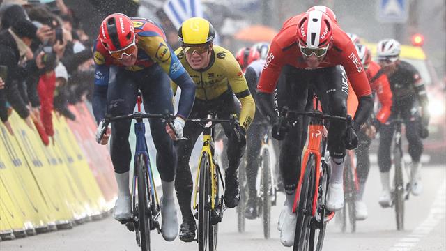 "Mads Pedersen und Josh Tarling liefern sich am Ende der 6. Etappe von Paris - NIzza ein Kopf-an-Kopf-Rennen um den Tagessieg mit dem besseren Ende für den Dänen Pedersen, der sich in der Kälte durchsetzt."