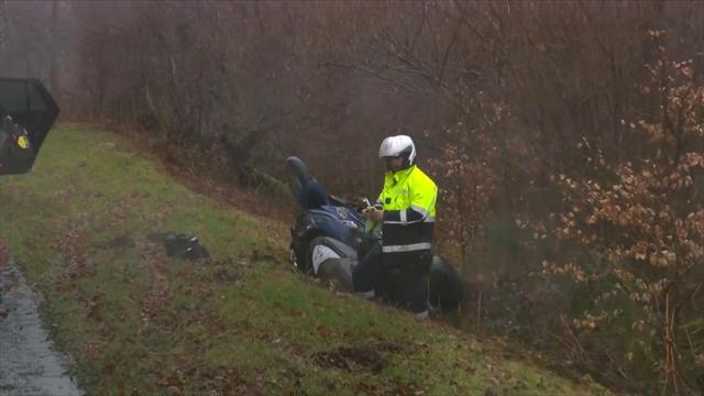 "Gendarm im Graben: Ein Polizei-Motorrad crasht im Regen auf der 4. Etappe von Paris - Nizza und sorgt damit für die Neutralisation des Rennens angesichts des Risikos."