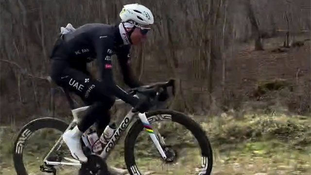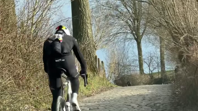 "Tadej Pogacar testet die Roubaix-Strecke auf den gefütrchteten Pavés im Wald von Arenberg und nährt so Gerüchte über einen Start beim Kopfsteinpflaster-Klassiker."