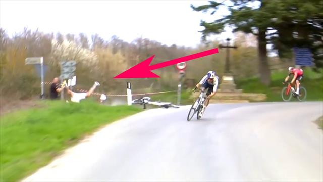 "Tadej Pogacar liegt bei der Strade Bianche im Führung, überschlägt sich dann aber bei einem fiesen Sturz in den Graben und fällt kurzzeitig zurück."
