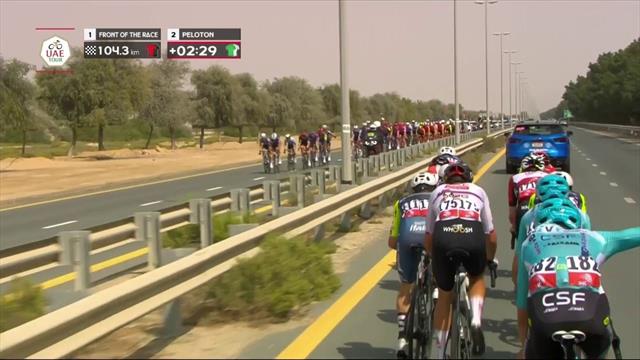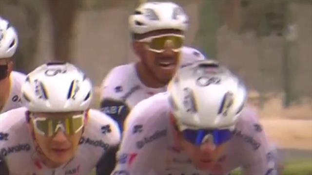 "Aufreger bei der Verfolgungsjagd auf der 5. Etppe der UAE Tour: Die Ausreißergruppe um Tadej Pogacar fährt hinter Auto im Windschatten - das Feld wütet!"