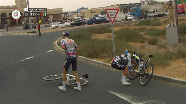 "Crash von Ben Zwiehoff und Einar Rubio: Ärgerlicher Sturz für den Red-Bull-Profi auf der 4. Etappe, der in der Gesamtwertung der UAE Tour noch aussichtsreioch platziert ist."